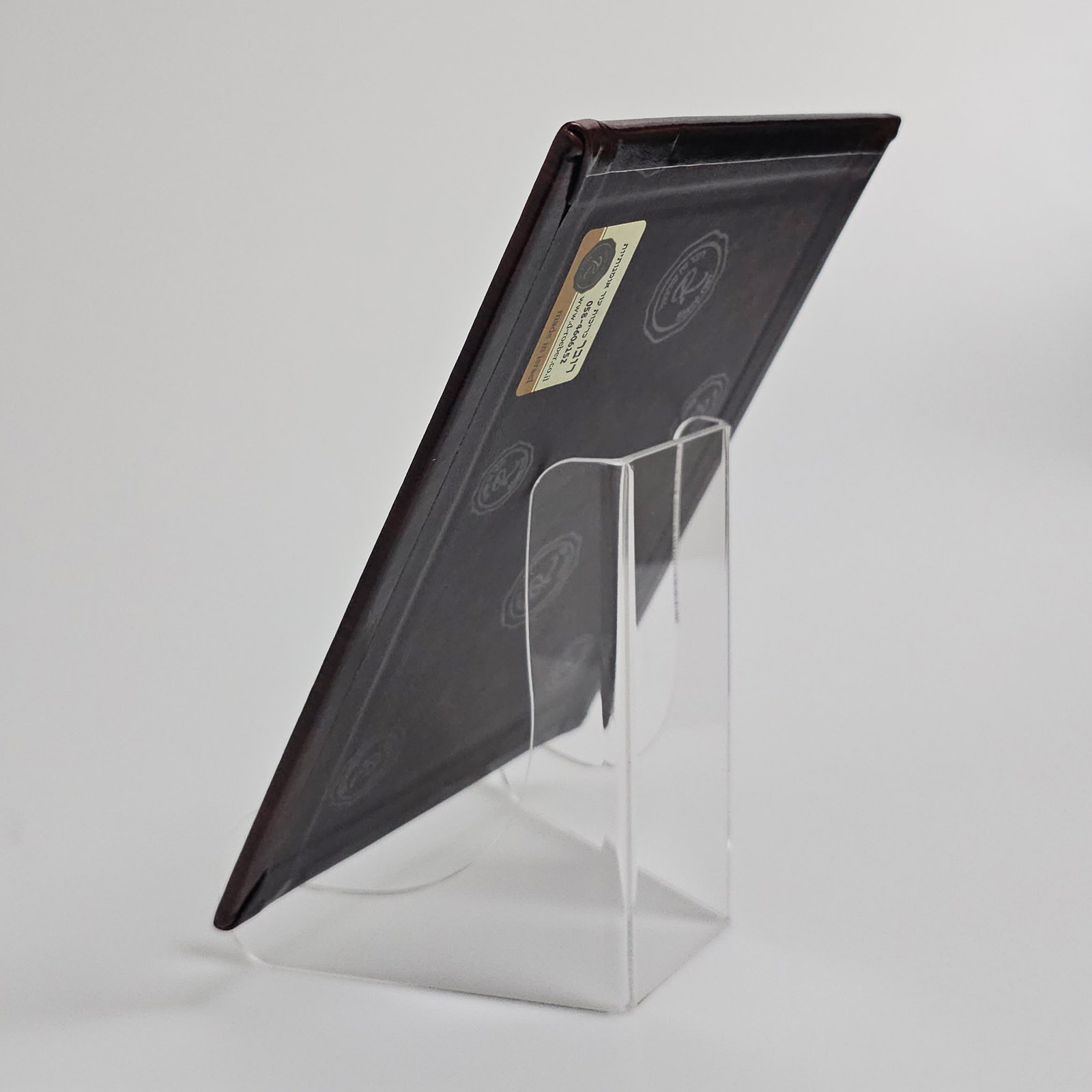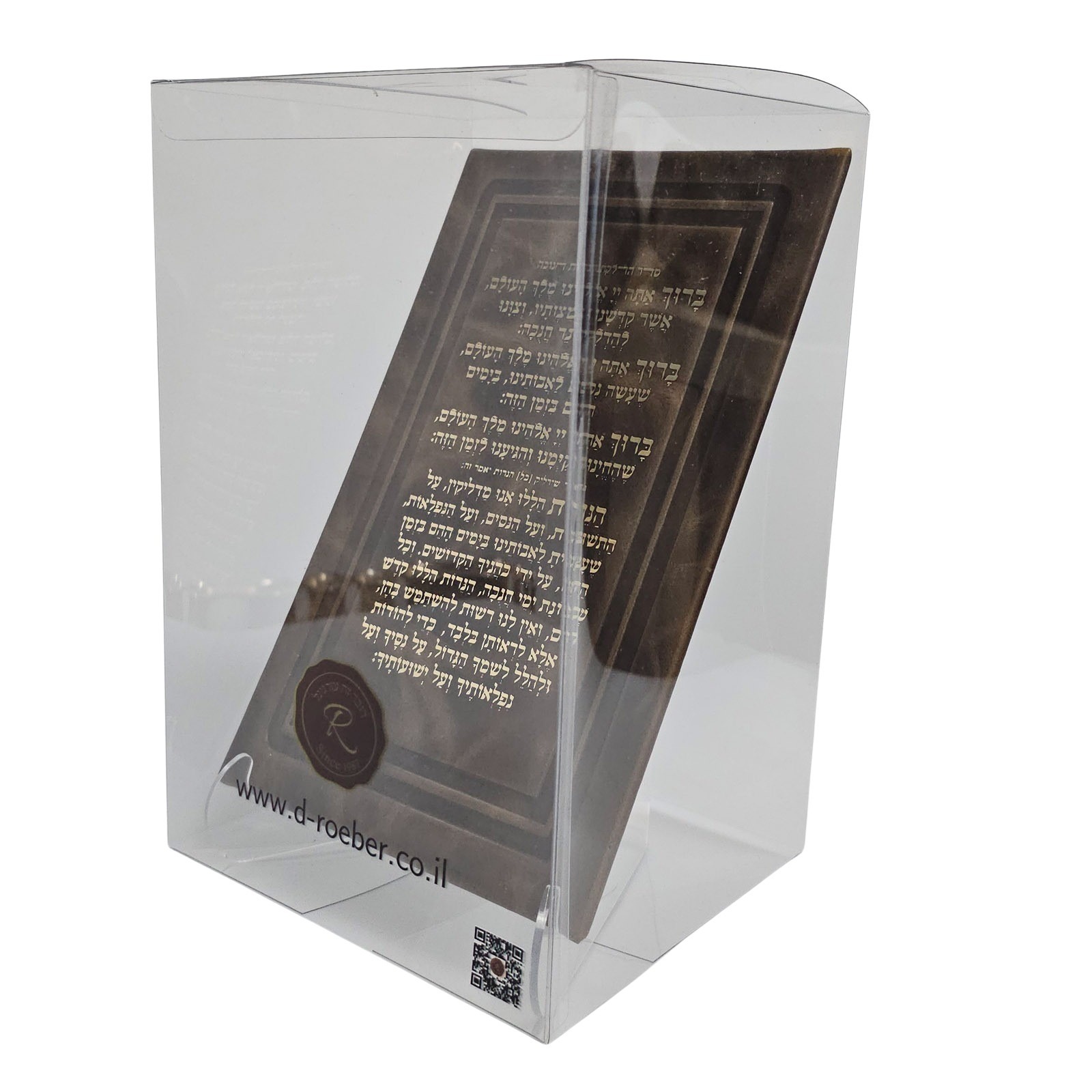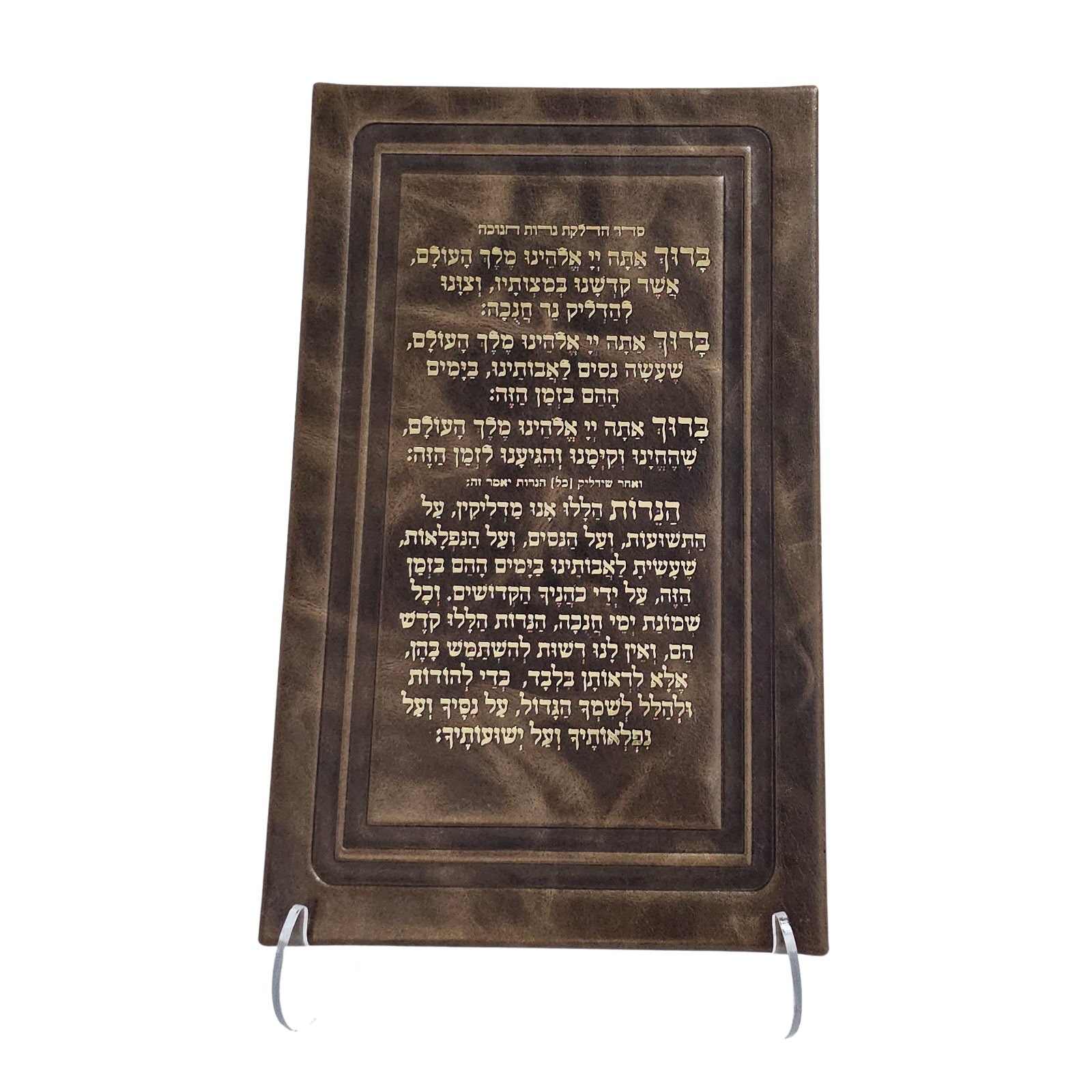 סדר הדלקת נרות חנוכה בכריכת עור אמיתי – כולל את הברכות ונוסח "הנרות הללו", עם הטבעה בזהב. מגיע על סטנד אקרילי שקוף ובתוך קופסא שקופה