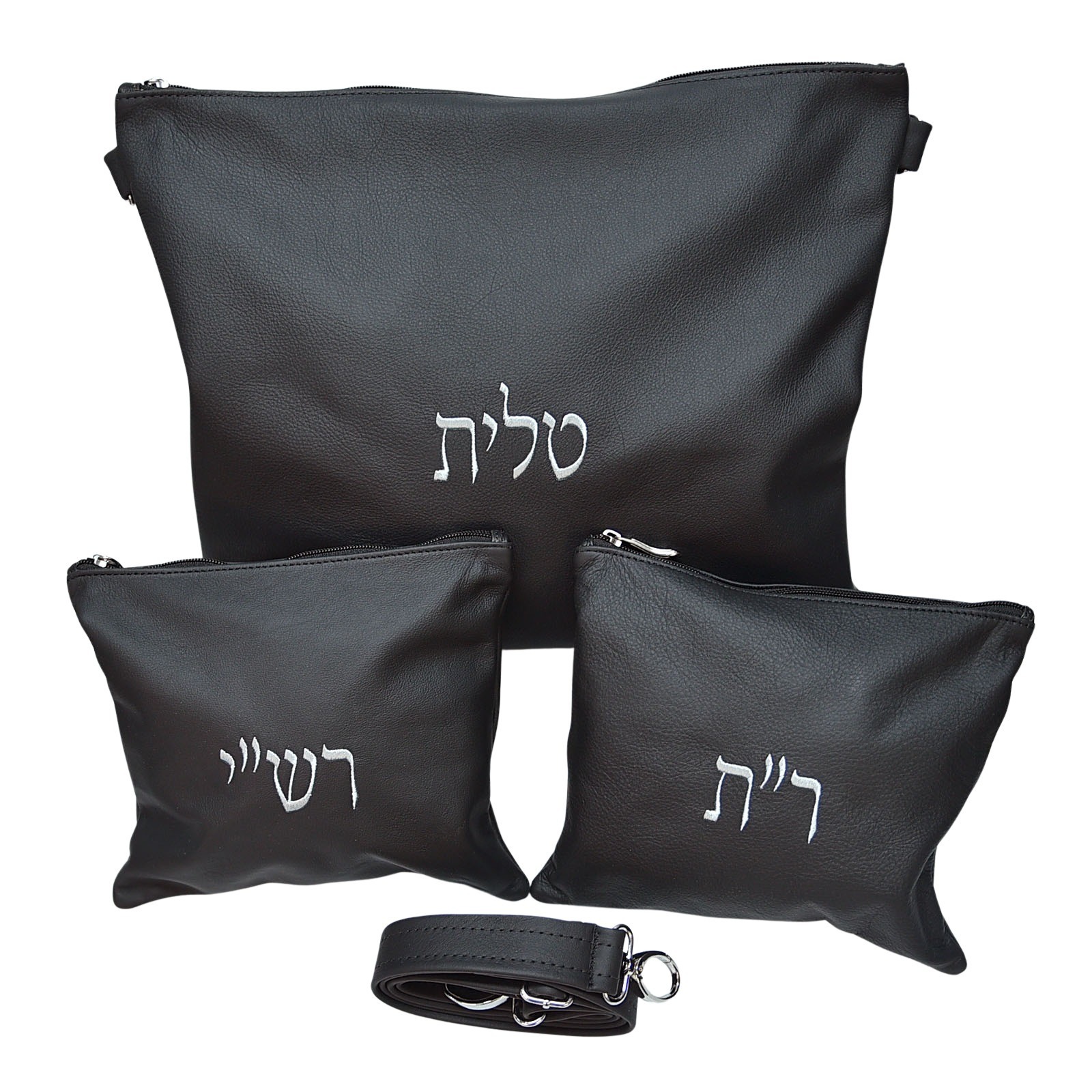 סט תיקי עור אמיתי לטלית ותפילין (דגם חב”ד) – כולל רש”י ור”ת ורצועת נשיאה מעור – צבע שחור