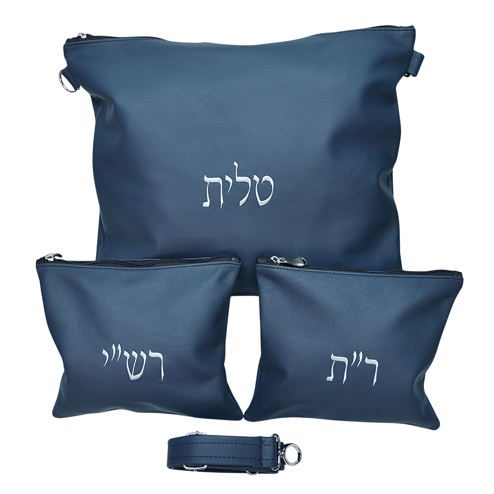 סט תיקי עור אמיתי לטלית ותפילין (דגם חב”ד) – כולל רש”י ור”ת ורצועת נשיאה מעור – צבע כחול נייבי