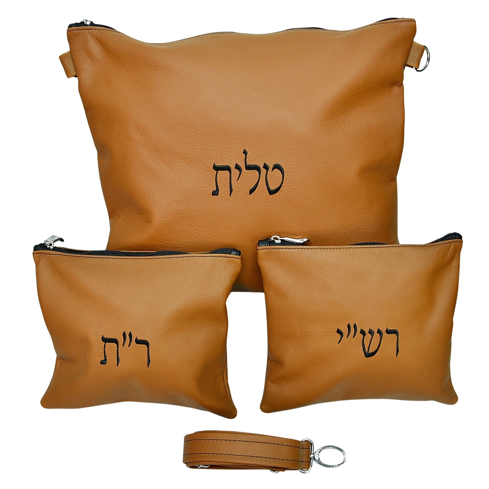 סט תיקי עור אמיתי לטלית ותפילין (דגם חב”ד) – כולל רש”י ור”ת ורצועת נשיאה מעור – צבע חום קוניאק