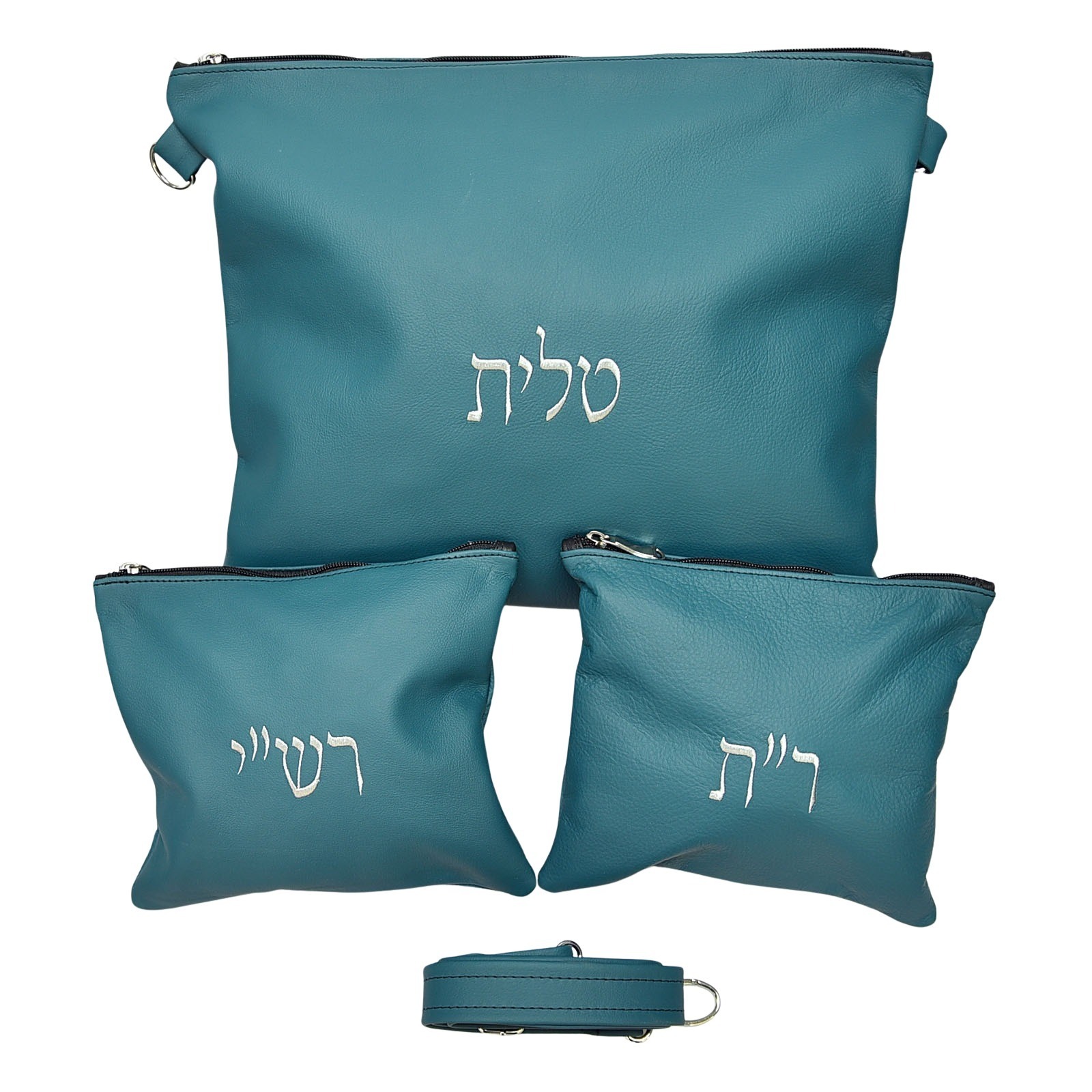 סט תיקי עור אמיתי לטלית ותפילין (דגם חב”ד) – כולל רש”י ור”ת ורצועת נשיאה מעור – צבע טורקיז מעושן