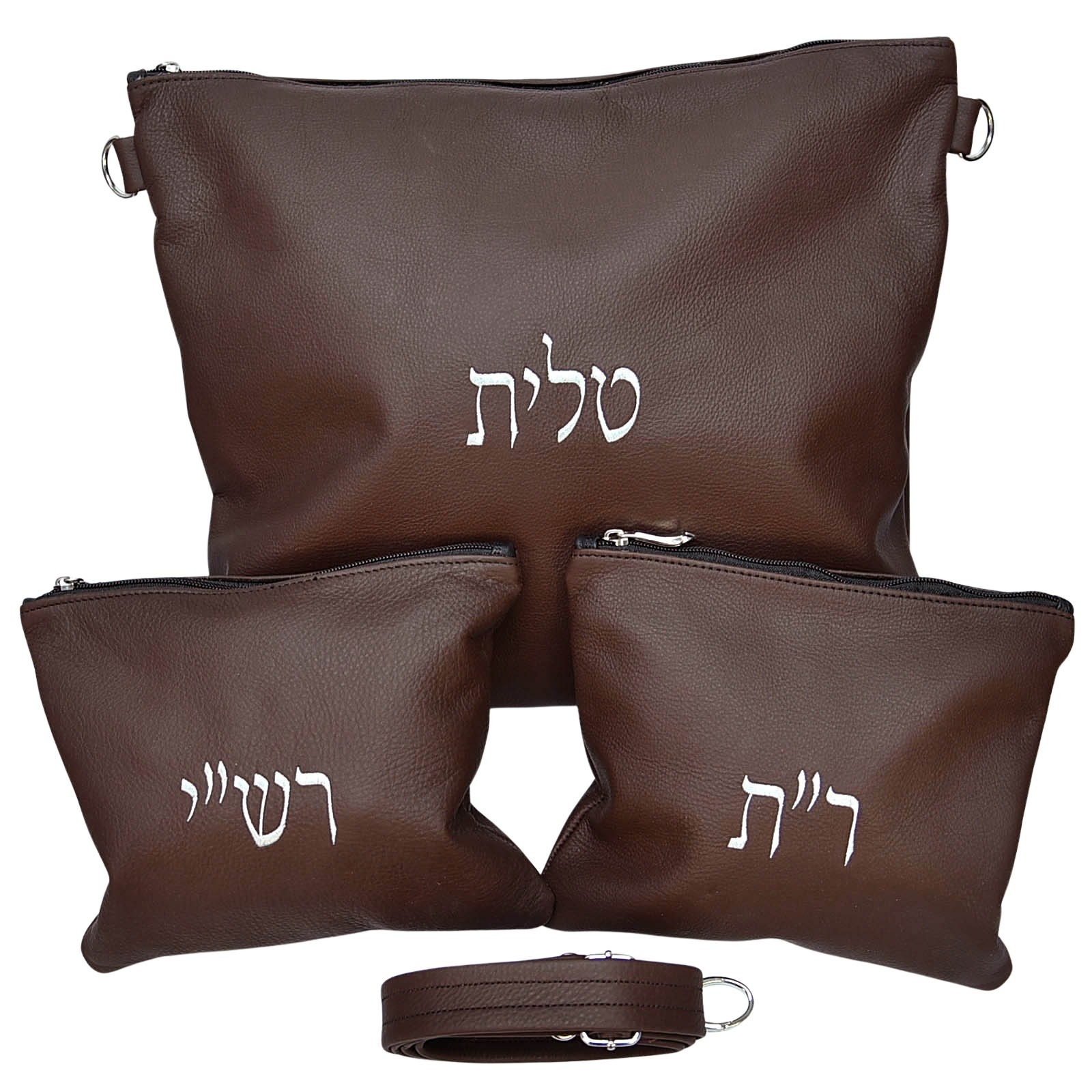 סט תיקי עור אמיתי לטלית ותפילין (דגם חב”ד) – כולל רש”י ור”ת ורצועת נשיאה מעור – צבע חום שוקולד